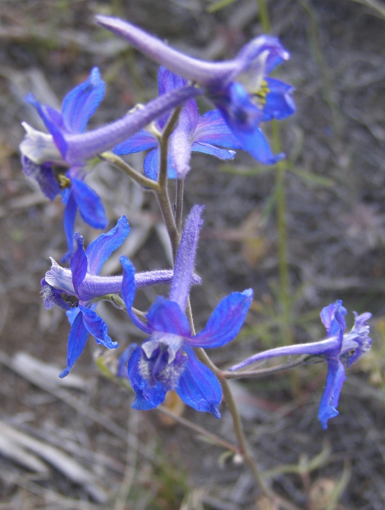 Low Larkspur growing on grassy dry sidehills along the Chilcotin River at Farwell Canyon, near Riske Creek, B.C., May 13, 2010. Note contrasting violet veining on the cobalt blue petals.
