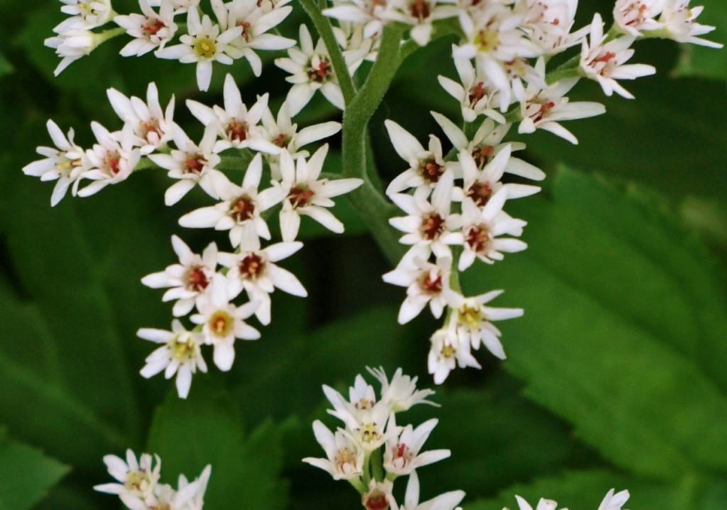 Mukdenia rossii forms a compact clump which expands by slowly creeping rhizomatous roots. Rosy-blushed, crowded bud spikes emerge in earliest spring a little before the foliage, and the budding stems and leaves grow a little day by day, until at last, in late April or early May, the first white stars appear. These add to the number day by day, until at last the branched panicles are drooping from their combined weight; the show lasts for weeks, well into June if we don’t have a heat wave. The flowers slowly fade to brown, and the aging seed heads may be left in place or clipped off if you are of the exceedingly tidy sort.