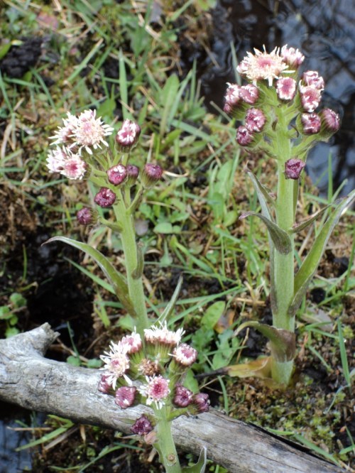 Sweet Coltsfoot – Petasites frigidus var. nivalis (we’re pretty sure) – near Tyee Lake, B.C., May 9, 2014. The Petasites send up their flower stalks early in the spring from creeping rootstalks, with emergence of the handsome foliage coming later.