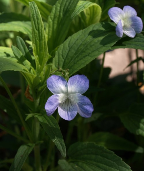 The European tall woodland violet, Viola elatior, has naturalized nicely in the shady parts of the garden. Pale purple and white flowers are produced in great profusion in May.
