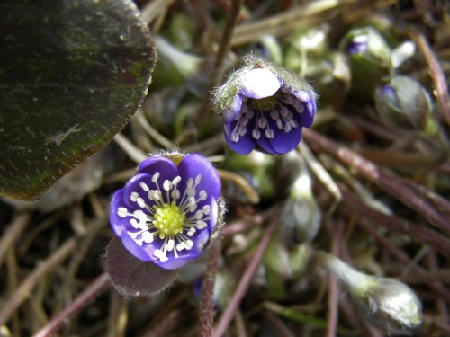 Hepatica nobilis – Our treasured clump of this earliest-blooming eastern North American wildflower is loaded with buds – a month of pure pleasure is at hand – the daily check-in to see the progress of the delicate blooms has started. Image: HFN