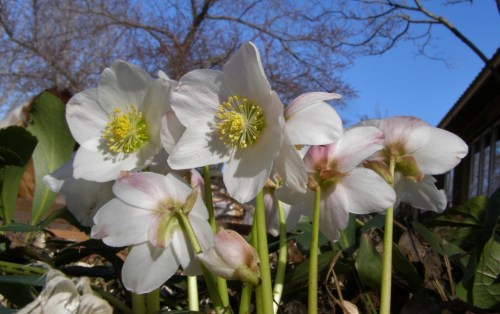 Christmas Rose – Helleborus niger. One of the hardiest of the Hellebores, and the best suited to our region. Buds form under the snow, to burst into bloom on the first warm days. Foliage is evergreen, so we heap dry shavings over our plants to prevent excessive leaf loss. Gardeners with reluiable snow cover needn’t bother. Image: HFN