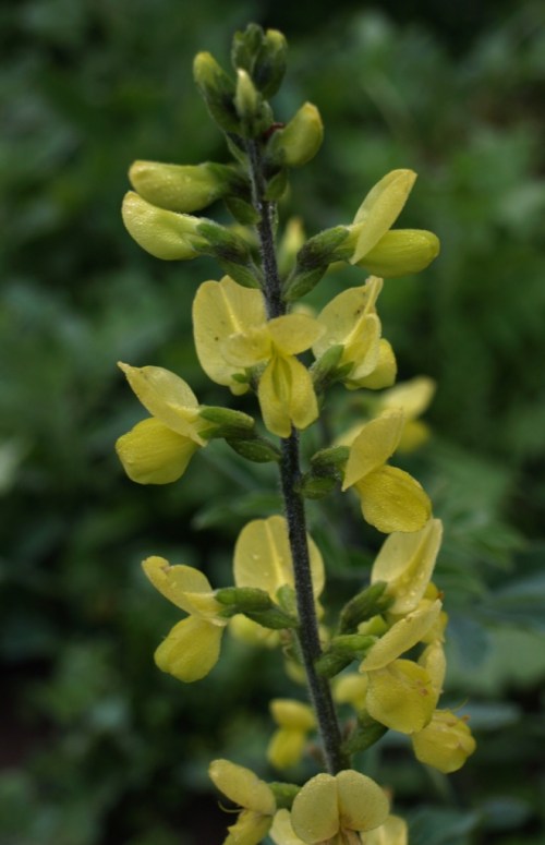 Sulphur-yellow pea-flowers of Siberian Lupine, Thermposis lanceolata, bloom in mid May. New growth and stems are flushed rich indigo.