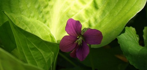 Viola sororia ‘Red Emperor’ and Hosta leaves.