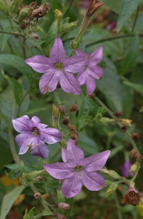 Annual Nicotiana affinis. This self seeds in the bed where we planted it years ago. I think it is ‘Daylight Sensation’ – tall, very fragrant at night, and lovely shades of purple.
