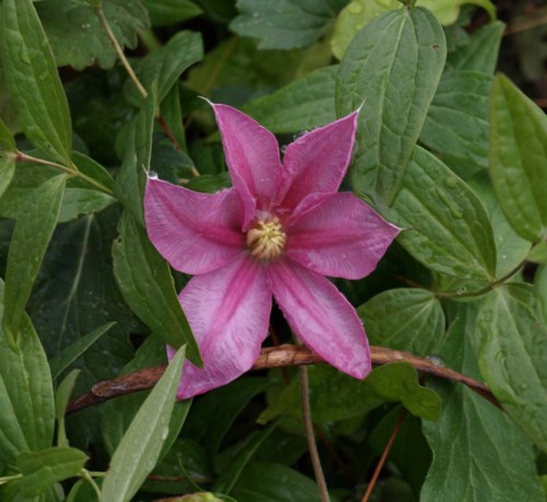 Here’s a real surprise! An unexpected flower on a summer-blooming hybrid clematis. Bad timing, but we’re enjoying it.